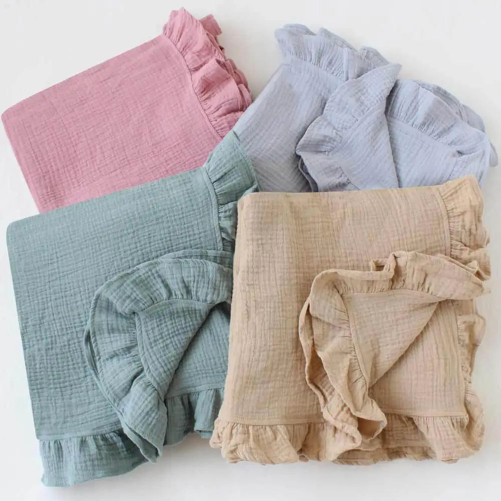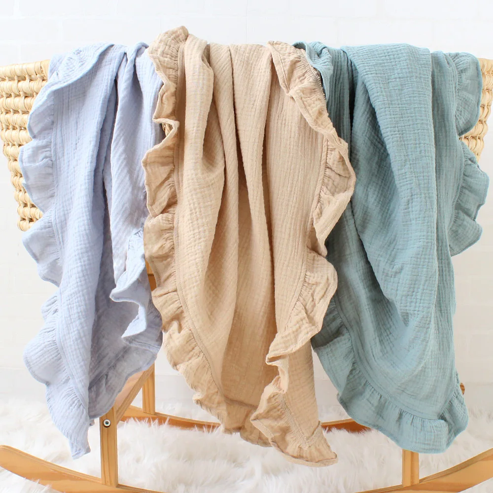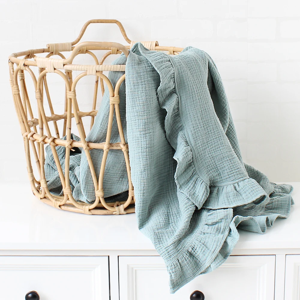 Kocyk muślinowy ozdobiony jest delikatną falbanką, co nadaje mu elegancji i wyjątkowego uroku. To idealny dodatek do wyposażenia dziecięcego.