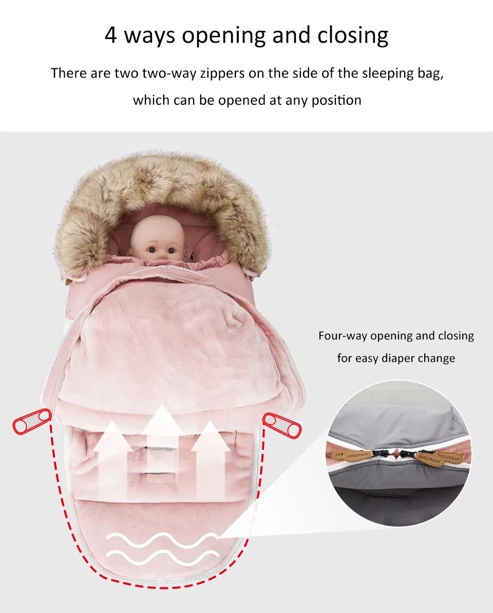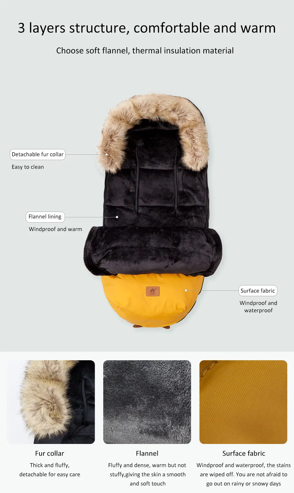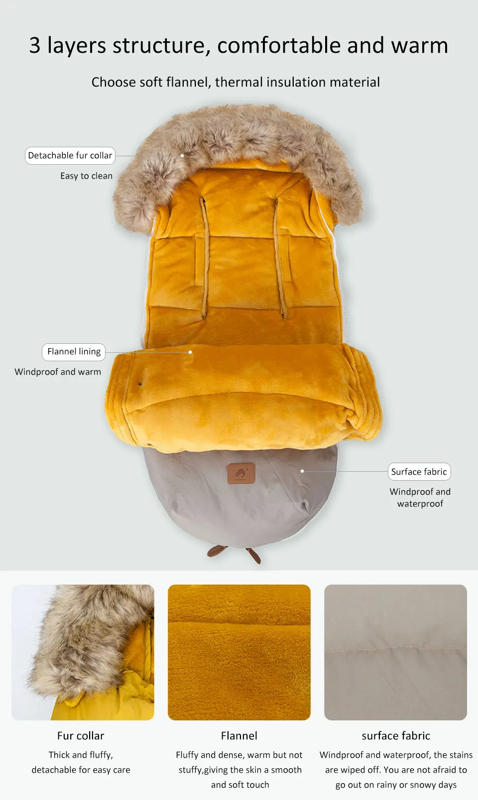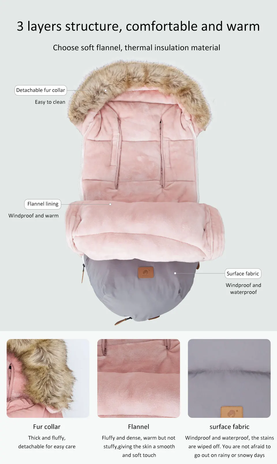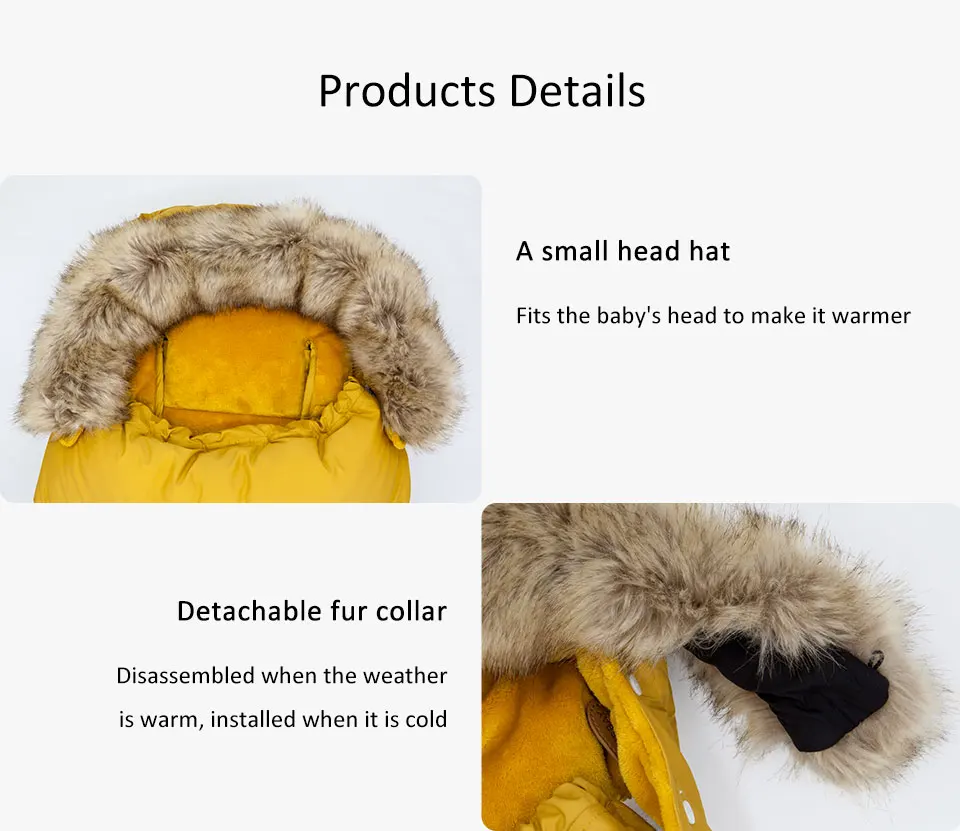 Dodatkowo, śpiworek posiada eleganckie, odpinane futerko wokół kaptura, które nie tylko pełni funkcję estetyczną, ale także dodatkowo chroni główkę dziecka przed zimnym powietrzem i wiatrem.