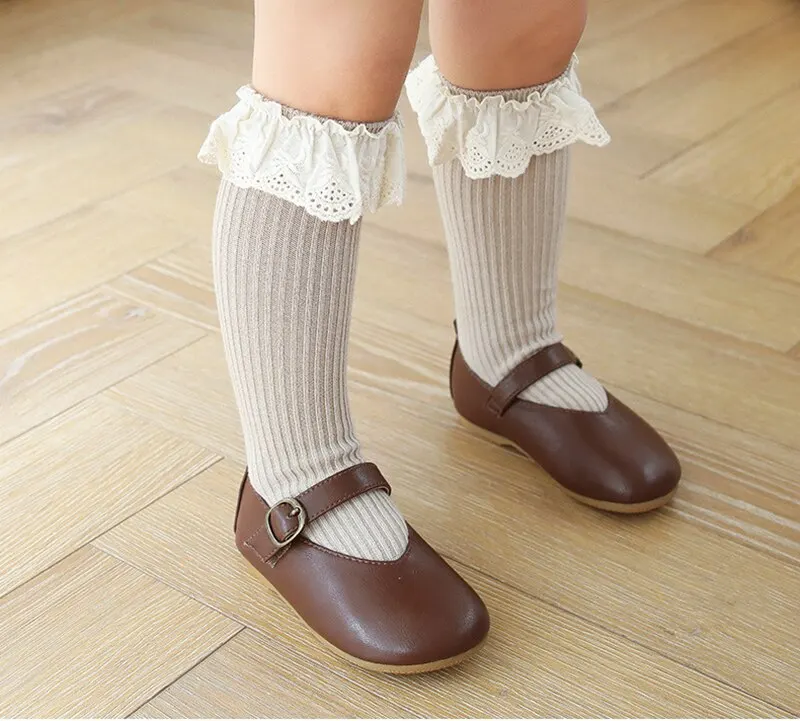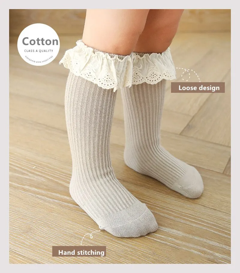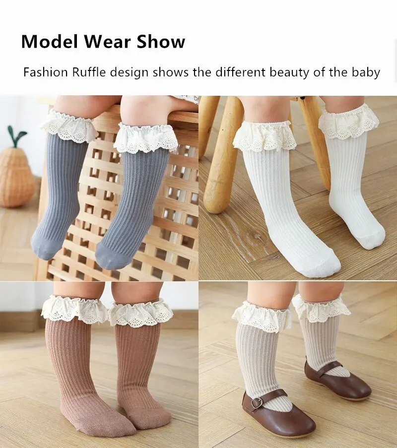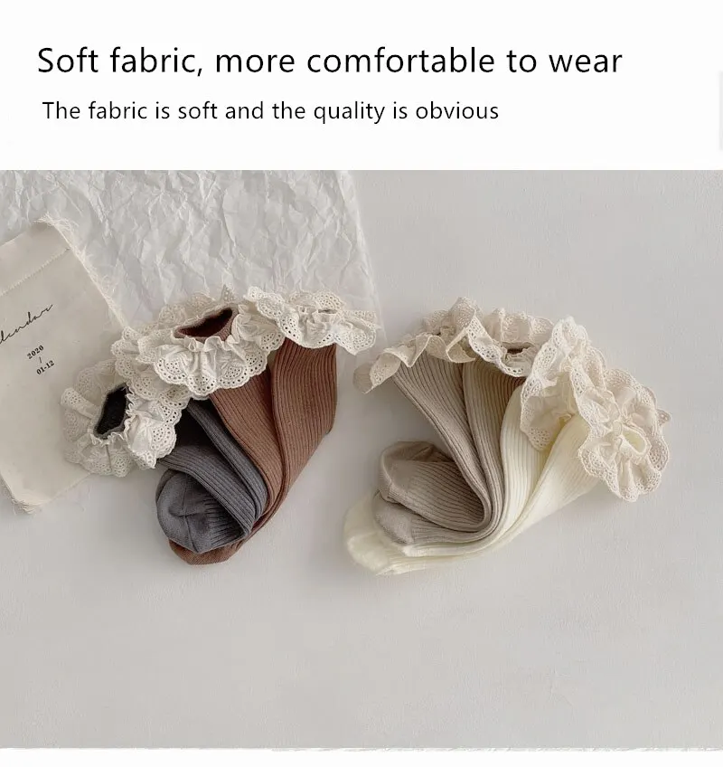 Skarpetki ozdobione są delikatną koronkową falbanką, która nadaje im uroku i elegancji.